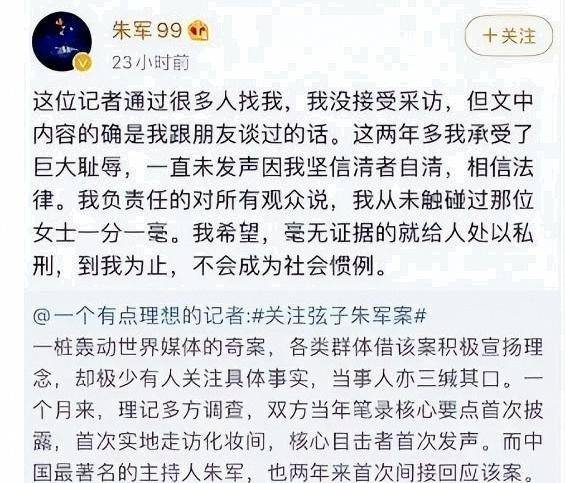 时间线日,弦子在央视实习期间与朱军在《艺术人生》化妆间发生接触,第二天报警但未立案;